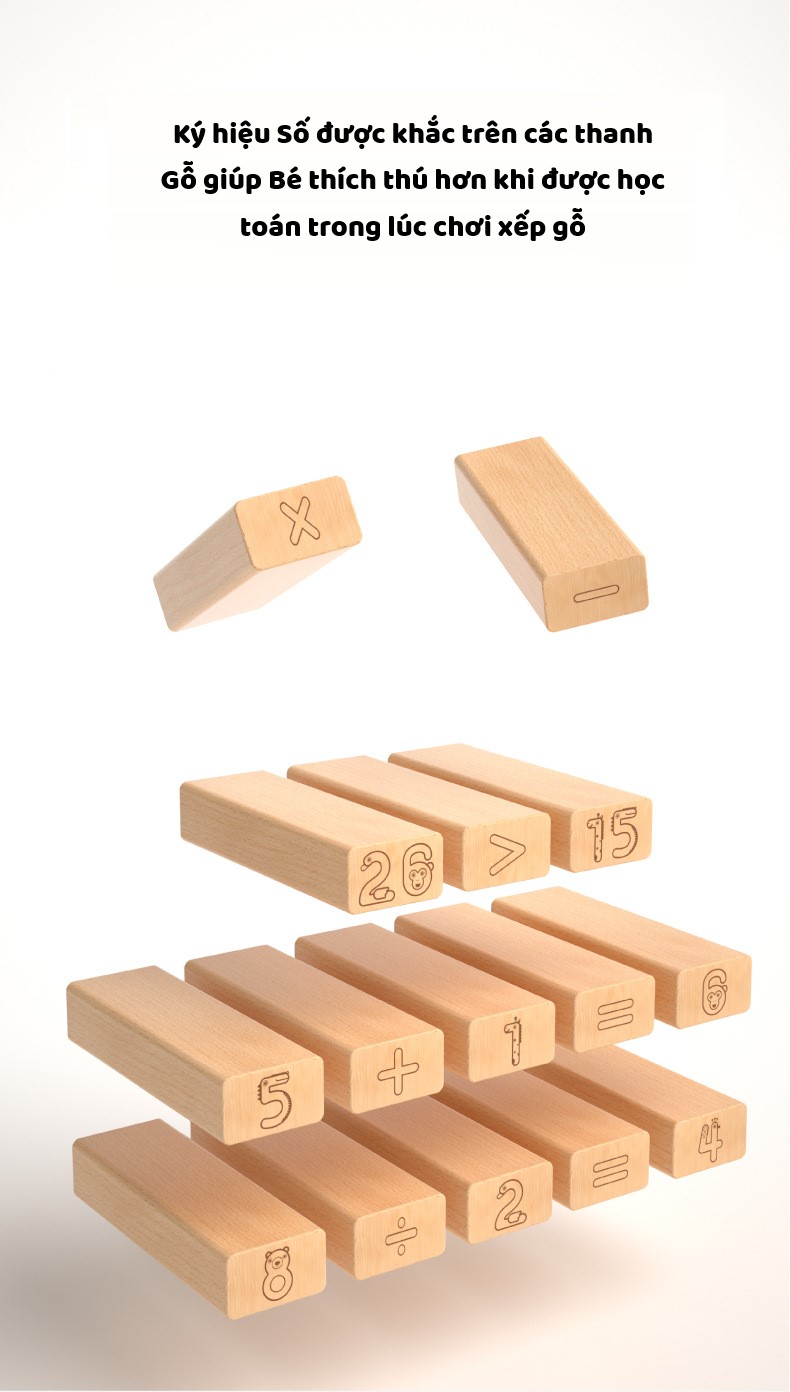 - Các khối gỗ in hình số học sẽ giúp bé vừa được làm quen với số, phép toán trong khi chơi.