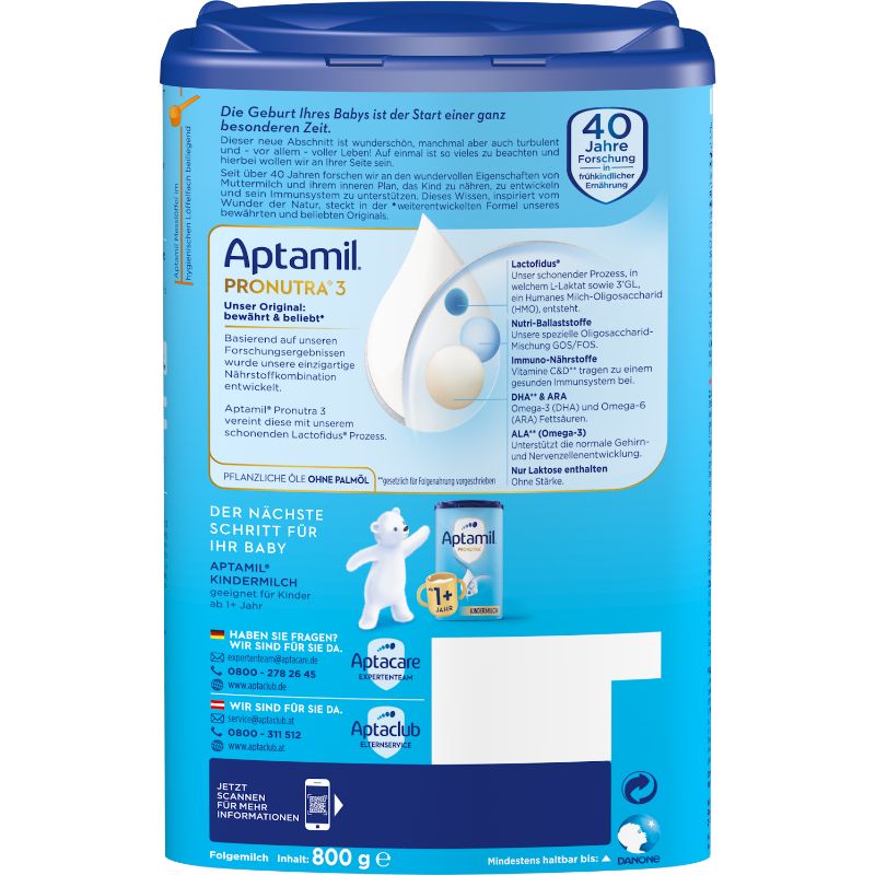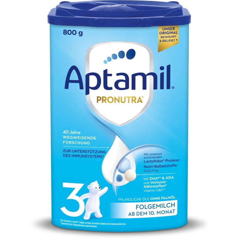 – Về dinh dưỡng : Cho trẻ bú mẹ hoàn toàn trong 6 tháng đầu là lý tưởng nhất. Giống như bất kỳ loại sữa tiếp theo nào, Aptamil® 3 Sữa tiếp theo không nên được sử dụng thay thế sữa mẹ trong 6 tháng đầu tiên, nhưng về nguyên tắc chỉ sau 6 tháng như một phần của chế độ ăn hỗn hợp. Tuy nhiên, nhu cầu tăng trưởng và phát triển cá nhân của bé có thể cần thêm các loại thực phẩm tiếp theo vào chế độ ăn của bé ở giai đoạn sớm hơn. Vui lòng tham khảo ý kiến bác sĩ nhi khoa của bạn.