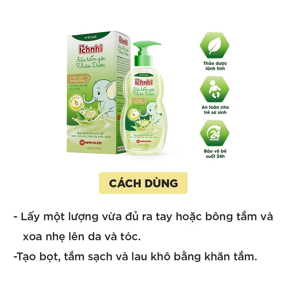 - Sản phẩm Sữa tắm gội thảo dược Ích Nhi được thiết kế chuyên biệt bé từ 0-12 tuổi.