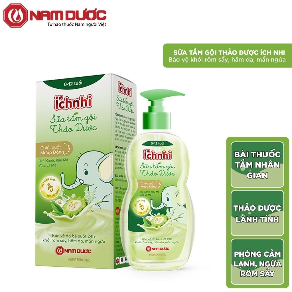 - Sữa tắm gội thảo dược Ích Nhi với thành phần 7 loại thảo dược sạch, đạt chuẩn theo bài thuốc tắm dân gian gồm Mướp đắng, trà xanh, Cúc La Mã, Rau má, tinh dầu Tràm, tinh dầu Hương nhu và tinh dầu Mùi ta.