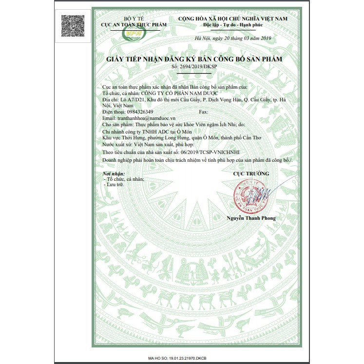 📝 Số giấy tiếp nhận ĐK bản công bố SP: 2694/2019/ĐKSP.