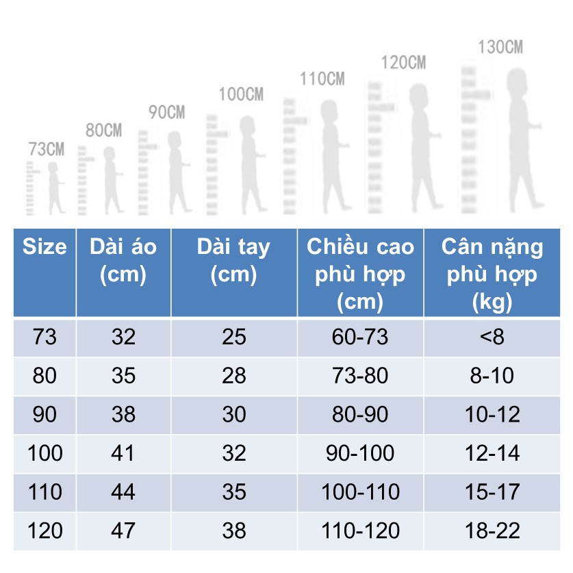 Khách hàng xem và chọn size theo ảnh chi tiết phân loại sản phẩm, theo chiều cao của trẻ sẽ chính xác hơn theo độ tuổi.